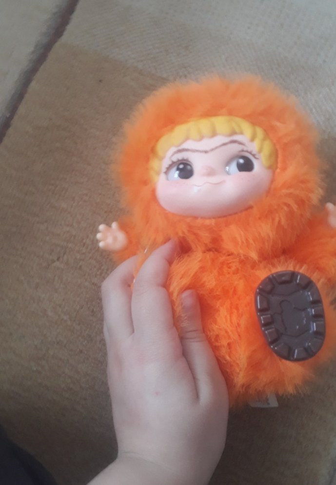 Turuncu tüylerle kaplı, sevimli yüzlü renkli peluş oyuncak bebek. Yumuşak ve sarılmaya uygun. tek ayagida var dikilir oyle cikti