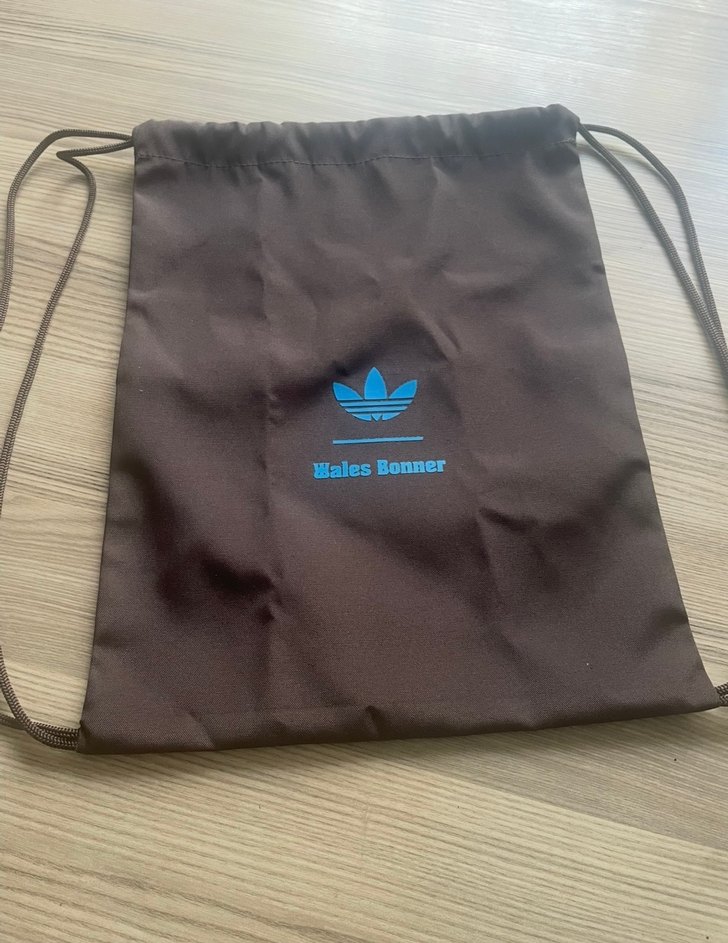 Koyu kahverengi spor çantasında mavi Wales Bonner baskısı bulunur. İpli kapama sistemiyle trend spor giyim tarzına uygundur.
