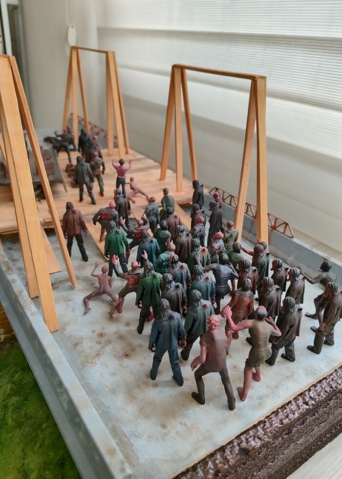 Alt metaryeller köpük çimen tozu reçine ve silikon ile dere efekti köprü de gerçek ahşap parçalar kullanıldı Rick ,zombiler ,römork dinamit,kasalar ve korkulukları reçine baskı olup sahnedeki tüm ambiansı vermeye çalıştım .Kendim sergilemekteyim hazır bulunmaktadır.