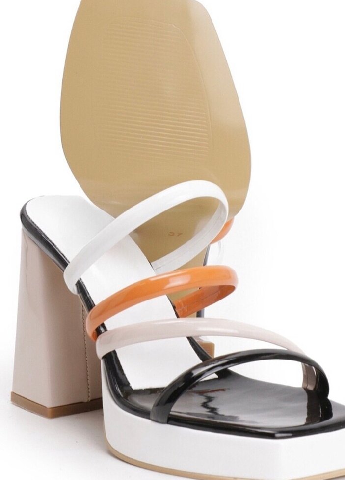Bej renkli, tokalı, çok renkli bantlara sahip kadın platform topuklu ayakkabı, günlük kullanım için kauçuk tabanlı.