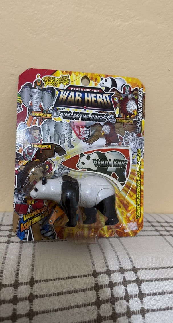War Hero Panda King aksiyon figürü beyaz ve koyu renklerde, dönüşebilen hayvan tasarımlarıyla. Canlı orman temalı ambalajda. Oyuncak minik silahı eksiktir. Bu sebepten dolayı uygun fiyatlıdır.