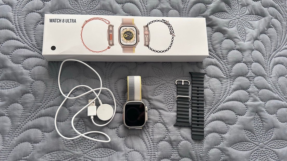 Kare kadranlı gri akıllı saat, kumaş ve siyah kayışlar ile birlikte şarj kablosu da dahil. ⌚sıkıntısı yoktur çalışır durumda iade kabul etmiyorum