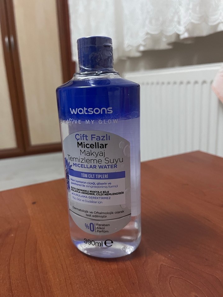 Watsons çift fazlı micellar makyaj temizleme suyu, 390 ml hacminde, tüm cilt tipleri için nazikçe temizler. Paraben içermez, dermatolojik olarak test edilmiştir.