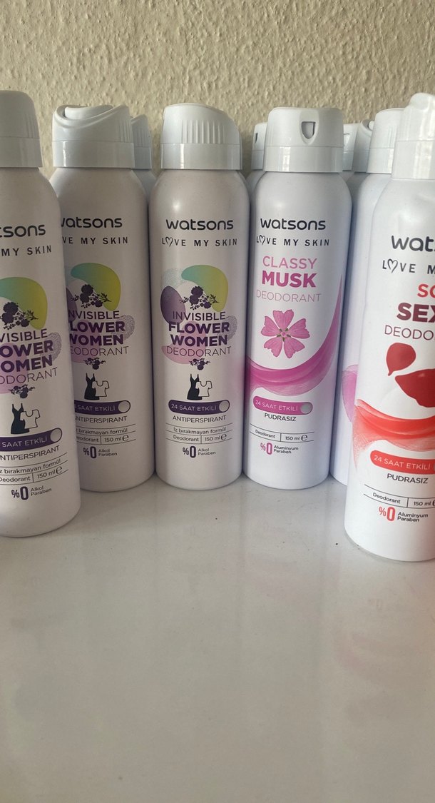 Watsons kadın deodorantları 24 saat koruma sağlar, pudrasız ve görünmez formüllüdür. Invisible Flower ve Classy Musk kokuları mevcuttur.