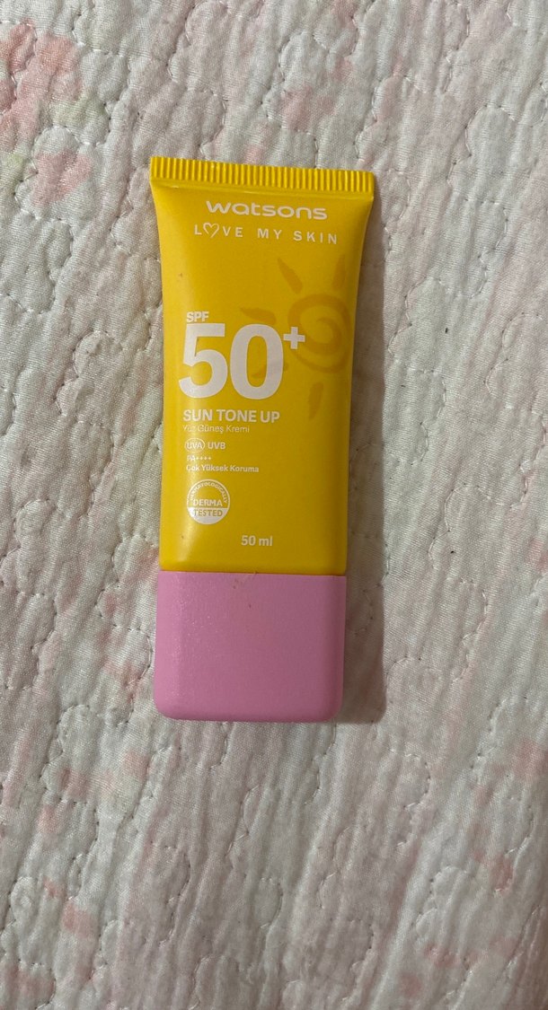 Watsons Love My Skin güneş kremi, 50 ml tüpte SPF 50+ UVA ve UVB koruması sağlar. Dermatolojik olarak test edilmiştir. ☀️