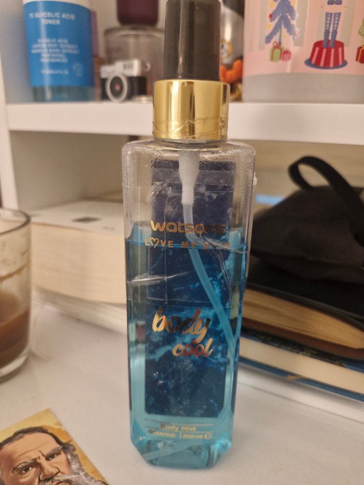 Watsons vücut spreyi, altın kapaklı şeffaf şişede ferahlatıcı mavi sıvı içerir. Hafif ve serin bir koku sunar.