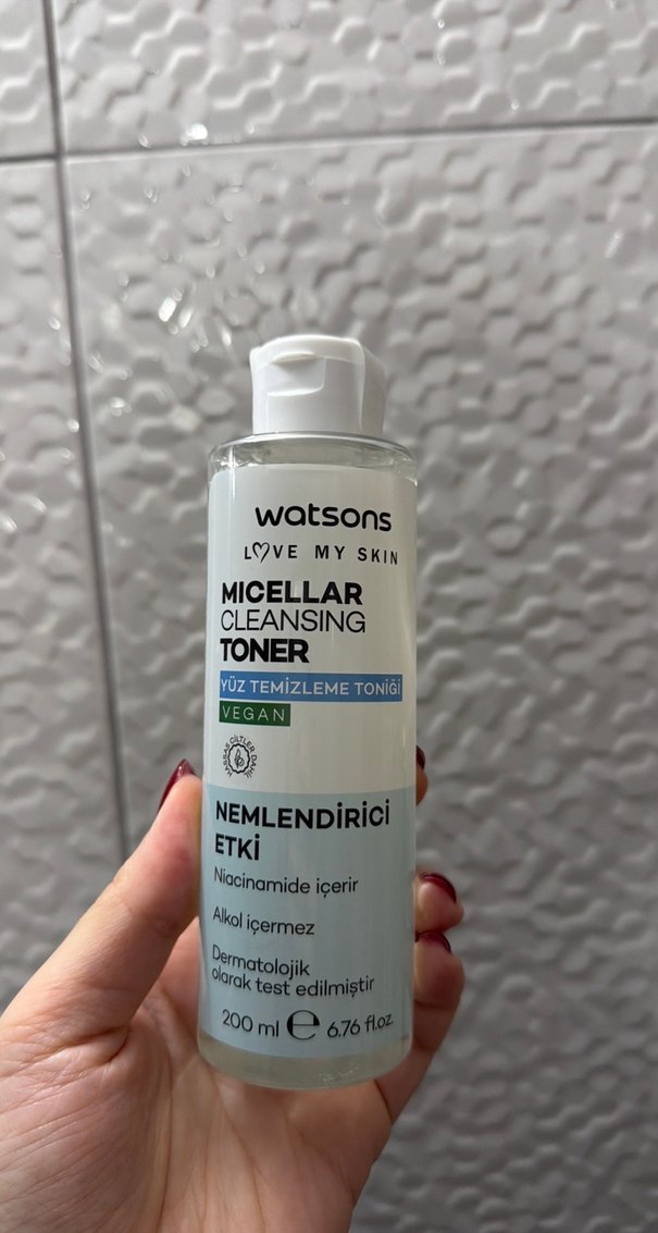 Watsons Micellar Cleansing Tonik, niasinamid içeriğiyle nemlendirici etki sağlar. Vegan, alkolsüz ve dermatolojik olarak test edilmiştir. Yüz temizleme için uygundur.