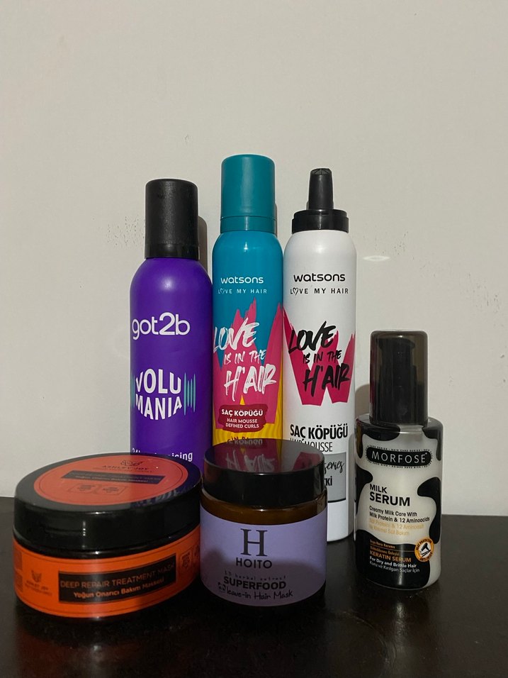 Watsons'un iki çeşit saç köpüğü, Got2b volumizing saç spreyi ve Hoito Superfood ile onarıcı iki saç maskesinden oluşan set. Saç şekillendirme ve bakım için uygun. ♀️ maskeler birer kez denendi. Köpükler dolu sadece beyaz olanın kapağı yok. Ashley joy saç maskesi 120 Hoıto saç maskesi 100 Morfose saç serumu 100 Got2B köpük 150 Diğer ikisi 50