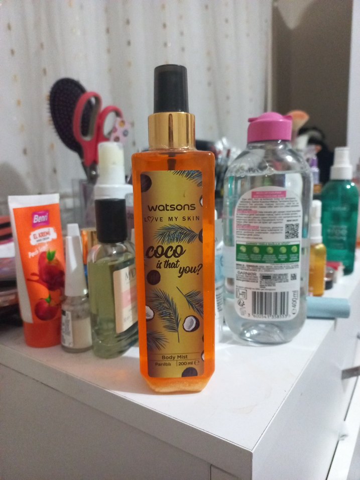 Watsons Vemy Skin Coco Body Mist, 200 ml sprey şişede ferahlatıcı hindistancevizi kokusu sunar.