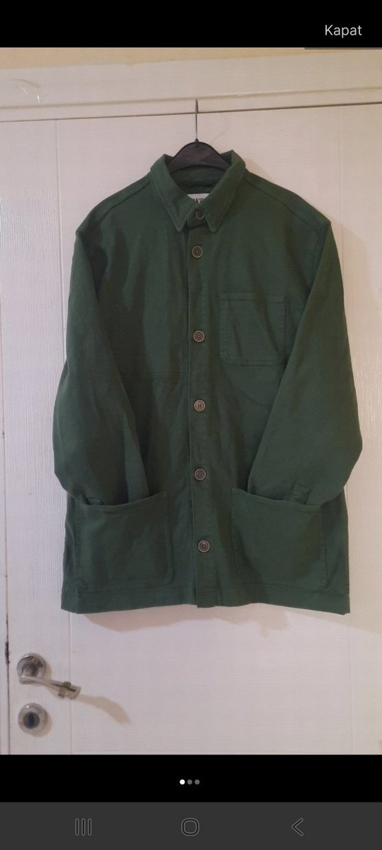 Düğmeli, uzun kollu, yeşil midi erkek ceket. Notlu yaka ve bol kesim ile günlük kullanıma uygun, yumuşak ve sıcak kumaştan yapılmıştır.