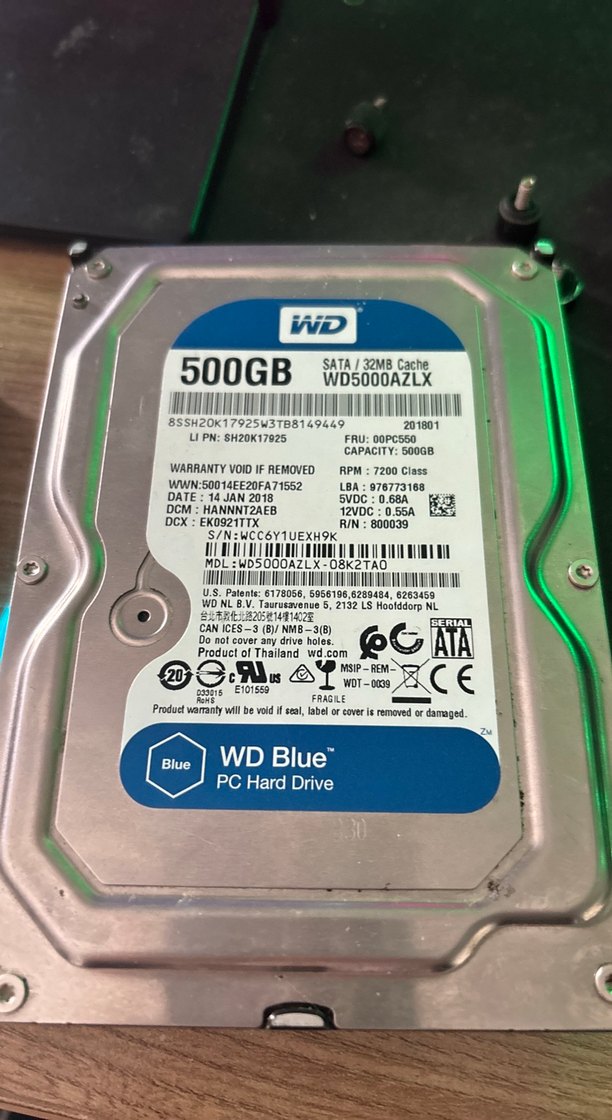WD Blue PC sabit disk, 500GB kapasite, SATA bağlantı, 32MB önbellek ve 7200 RPM hızına sahip.
