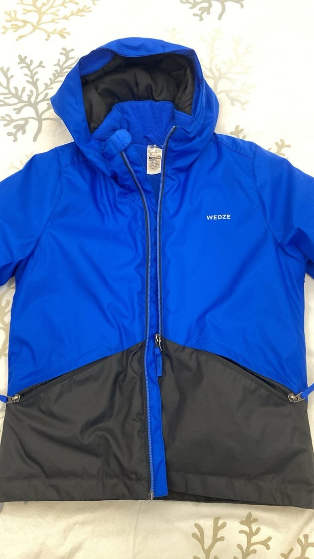 Wedze marka, kapüşonlu, fermuarlı, bol kesim mavi ve siyah erkek mont. İç kısmı yumuşak ve sıcak tutan kumaştan, dış mekan kullanımı için uygun. Decathlon marka sorunsuz 6 yaş