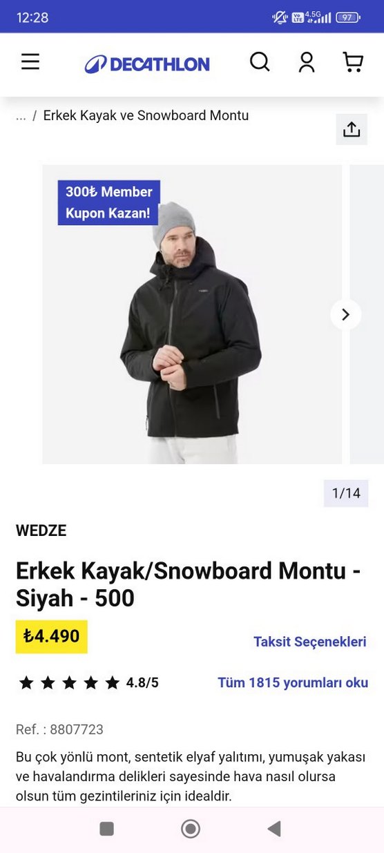 WEDZE siyah erkek kayak monttu L.beden M.beden mevcut su geçirmez sıcak tutar