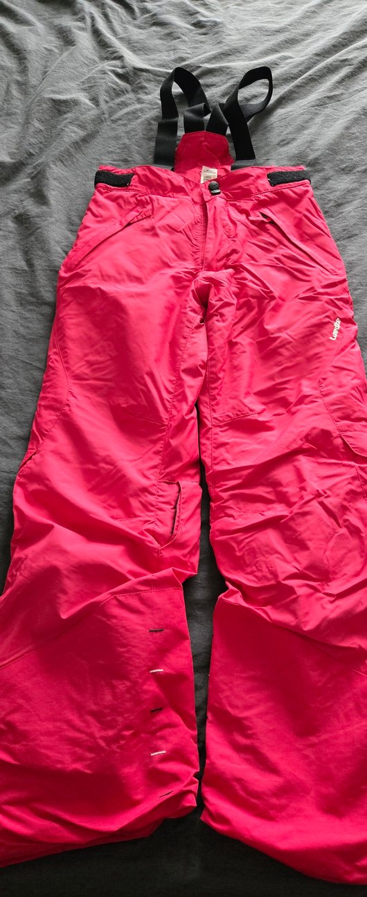 decathlon'dan 10 yaş için kıza da olur erkeğe de olur kayak pantolonu tertemiz yeniden farksızdır askıları istenirse çıkarılabiliyor ayak paça kısmı fotoğrafta da görüldüğü gibi içten ayarlamalıdır bacak kısımlarında cep mevcut üst tarafı kalın polar