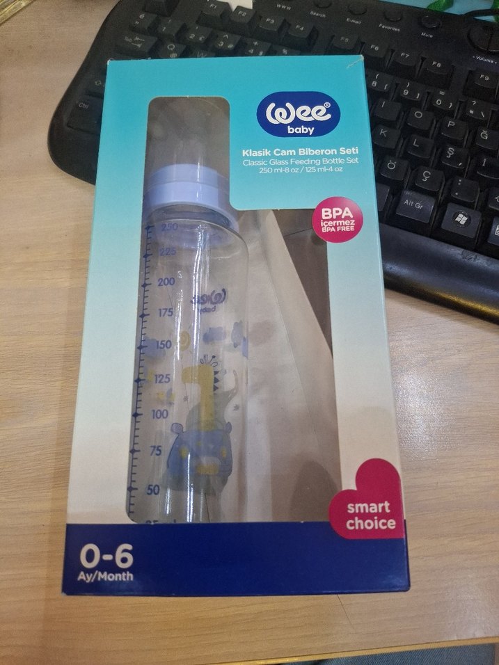 Wee Baby 0-6 ay bebekler için BPA içermeyen klasik cam biberon seti. Ölçü işaretleriyle doğru besleme sağlar. Pastel mavi renkte. sıfır ürün
