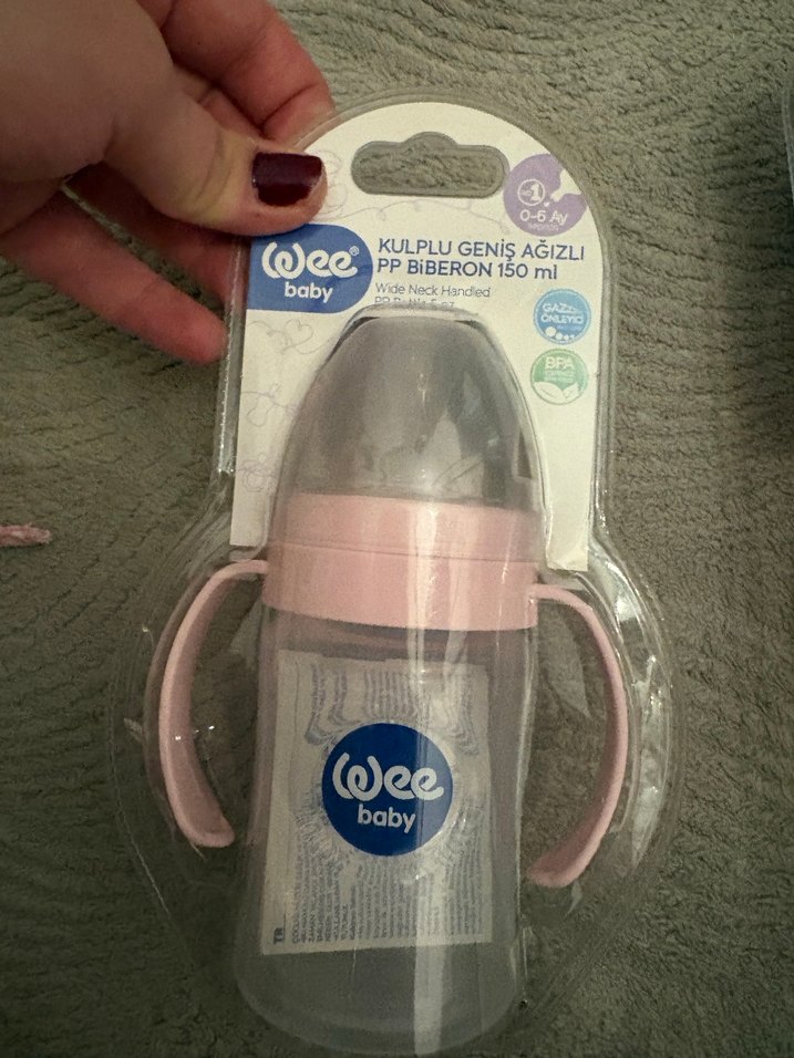 Wee Baby markalı, kulplu ve geniş ağızlı, BPA içermeyen 150 ml kapasitede pastel pembe biberon.