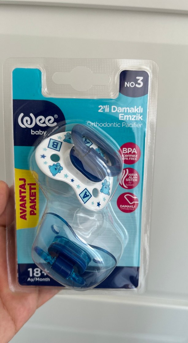 Wee Baby 18 ay ve üzeri bebekler için 2 adet hafif mavi renk damaklı ortodontik emzik sunar. BPA içermez, hava alma sistemi bulunur.