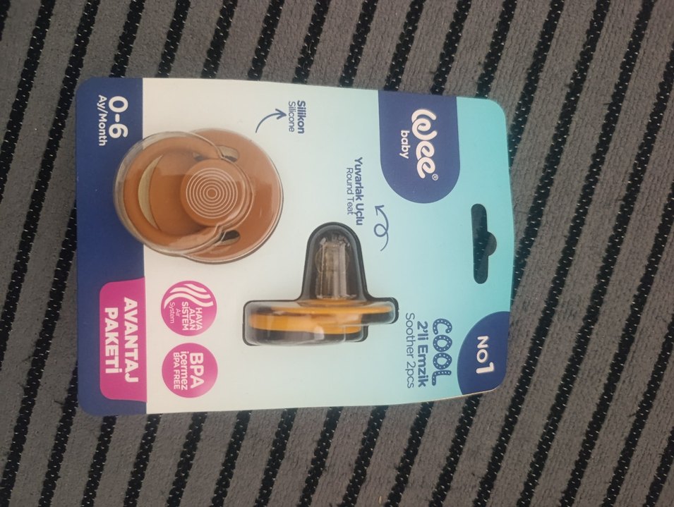 Wee Baby markasının 2 adet yuvarlak uçlu silikon emziği, BPA içermeyen güvenli malzemeden yapılmıştır. Açık kahverengi renktedir.
