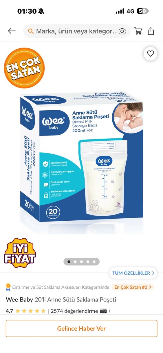 Wee Baby anne sütü saklama poşetleri 200ml kapasitede, 20 adetlik pakette. Steril ambalajlı, dondurucuya uygun, özel sızdırmaz tasarıma ve kilit sistemine sahip. Hiç kullanamadım.
