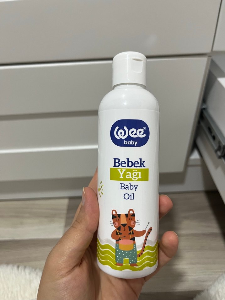Wee Baby bebek yağı, 200 ml beyaz şişede pastel detaylarla.