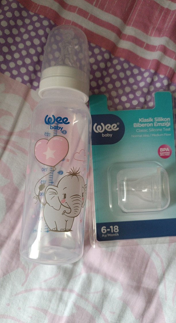 Wee Baby beyaz renkli, fil desenli pastel tasarımlı biberon. 6-18 ay arası klasik silikon emzikli, ölçü işaretli ve BPA içermeyen biberon. yedek emzik ucuyla beraber kullanılmadi aldığınızda uygun temizleyici ile temizleyin kaynatıp streil edin