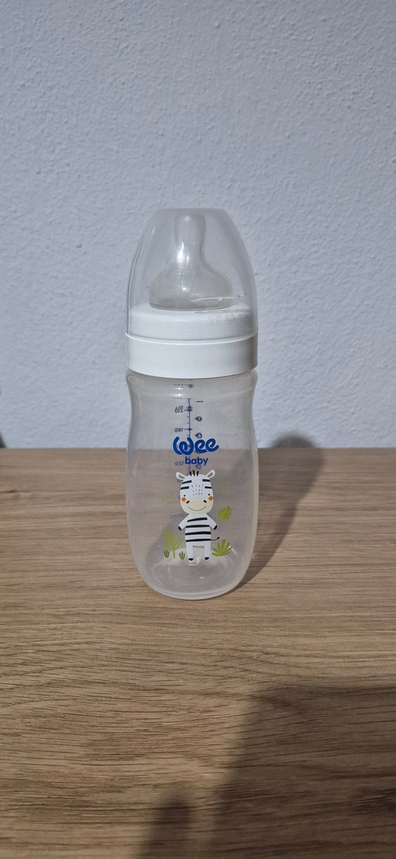 Silikon emzikli beyaz bebek biberonu, üzerinde zebra baskısı ve ölçü işaretleri bulunur.