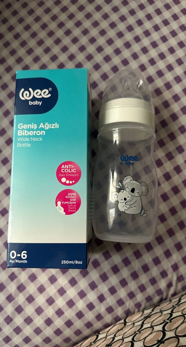 Wee Baby geniş ağızlı 250ml biberon 0-6 ay bebekler için uygundur. Gaz önleyici özellik ve yumuşak emzik içerir. Beyaz ve gri, koala desenlidir.