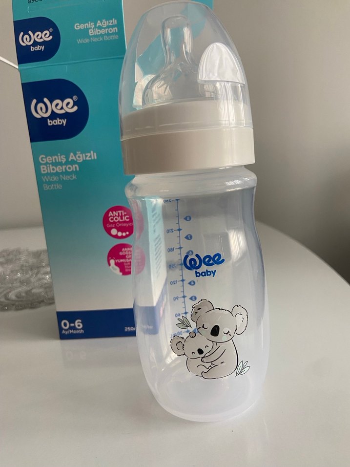 Wee Baby'nin geniş ağızlı biberonu, 0-6 ay bebekler için uygundur. Anti-kolik özelliği ve pastel beyaz renkte koala figürü bulunur.
