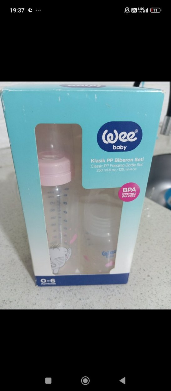 Wee Baby klasik 250ml PP biberon seti, BPA içermeyen malzemeden yapılmış, 0-6 ay bebekler için uygun, pastel pembe renkte ve ölçü işaretli iki biberon içerir. büyüğü hiç kullanılmadı yeni, küçüğü ise bir iki defa kullanıldı kapağı kayıp