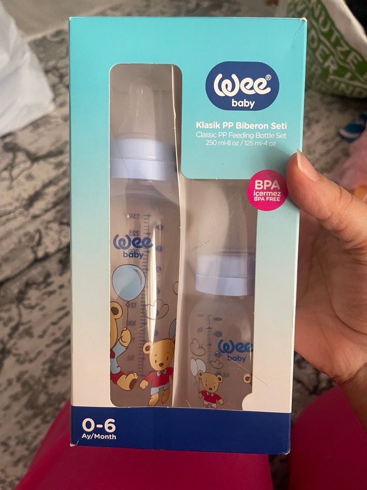Wee Baby Klasik PP beslenme biberon seti, 0-6 ay bebekler için pastel mavi renkte, BPA içermeyen 250 ml ve 125 ml biberonlardan oluşur. Ölçü işaretlidir. Hiç kullanılmadı