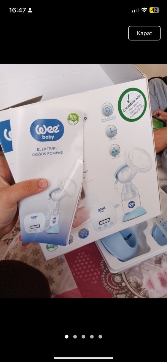 Wee Baby markasının açık mavi renkli elektrikli göğüs pompası BPA içermeyen malzemeden üretilmiştir, konforlu ve etkili kullanım sağlar.