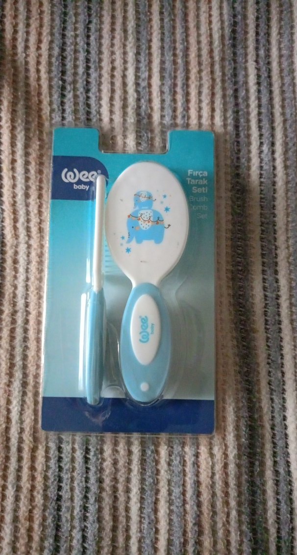 Wee Baby fırça ve tarak seti, yumuşak kıllara ve nazik tarak dişlerine sahiptir. Mavi renkli set sevimli fil desenlidir.