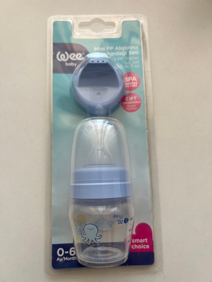Wee Baby mini biberon, yumuşak silikon emzik ve koruyucu mavi kapak içerir. 0-6 ay arası bebeklere uygun, ölçü işaretleri ve BPA içermez.