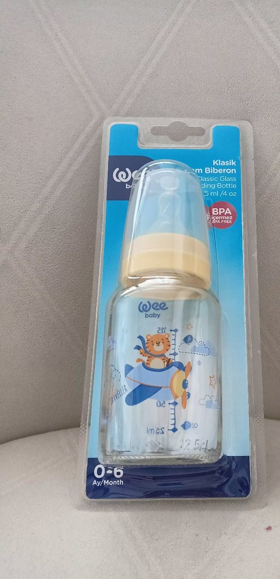 125 ml cam klasik bebek biberonu, BPA içermez. Pastel mavi renk ve sevimli desenlere sahiptir, 0-6 ay arası bebekler için uygundur. hiç kullanılmadı