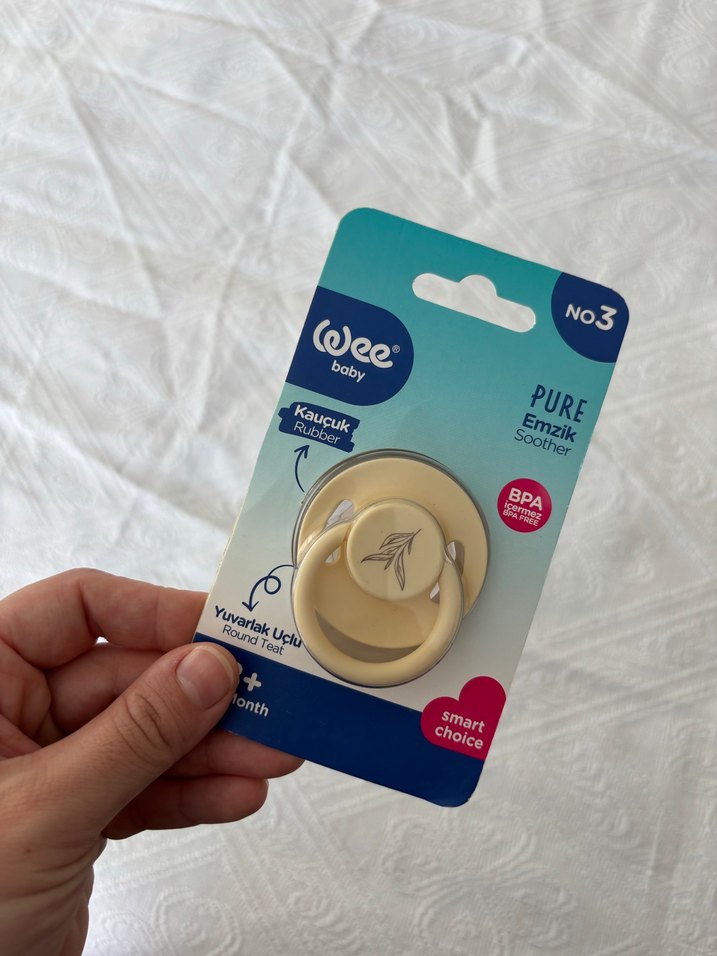 Wee Baby markalı, doğal kauçuktan yapılmış. Hiç kullanmadım kenardan açıp bakmıştım bebeğim emzik tutmadığı için ihtiyaç duymadım