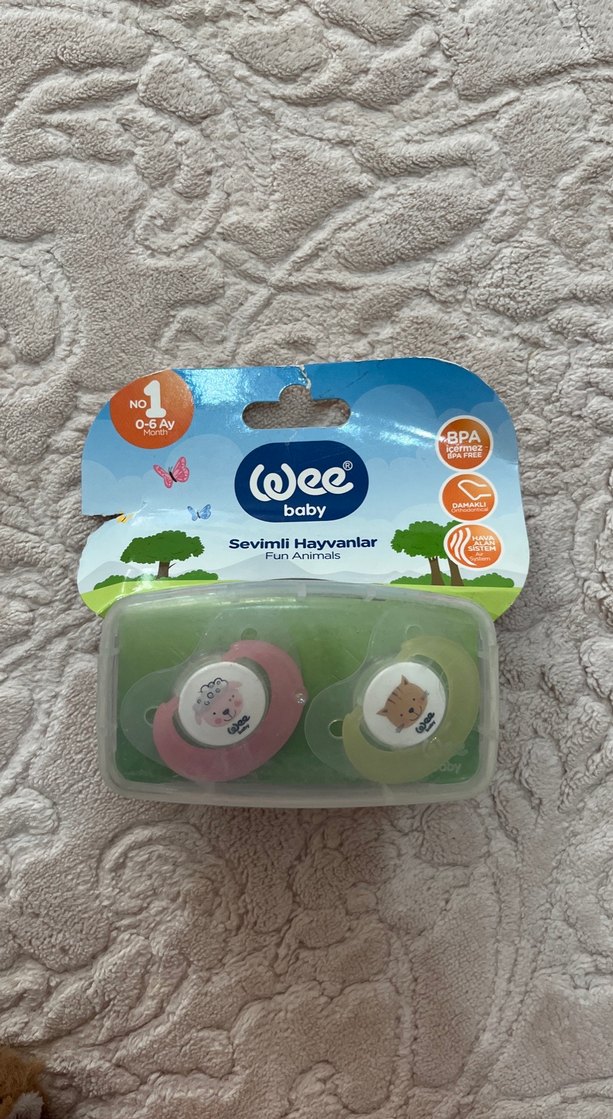 Bebekler için 0-6 ay arası uygun, BPA içermeyen Wee Baby pastel renkli, sevimli hayvan figürlü iki emzik seti. PAKET AÇILMADI 2028'e KADAR KULLANILMASI LAZIM