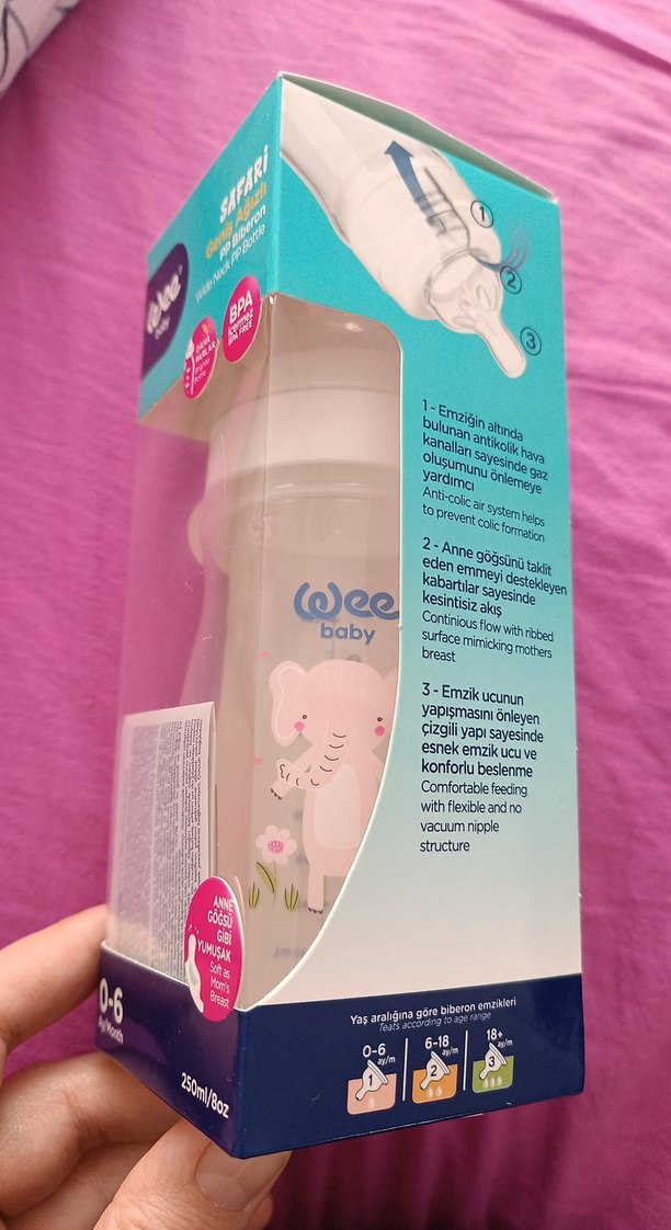 Wee Baby Safari geniş ağızlı 250ml biberon, BPA içermez. 0-6 ay bebekler için uygun, anne göğsü gibi yumuşak emzik içerir. Bir kaç kez denemek için kullanıldı ama bebeğim sevmedi