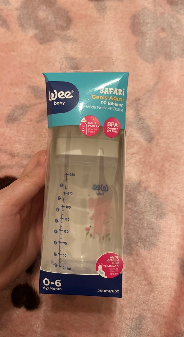Wee Baby Safari geniş ağızlı biberon, BPA içermez ve 250ml kapasitelidir. 0-6 ay arası bebekler için uygundur, yumuşak silikonlu emziklidir.