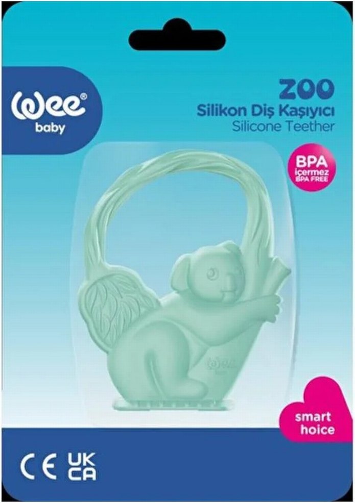 Turkuaz renkte, koala figürlü silikon diş kaşıyıcıdır. BPA içermez, yumuşak ve bebeklerin diş çıkarma döneminde rahatlaması için uygundur.