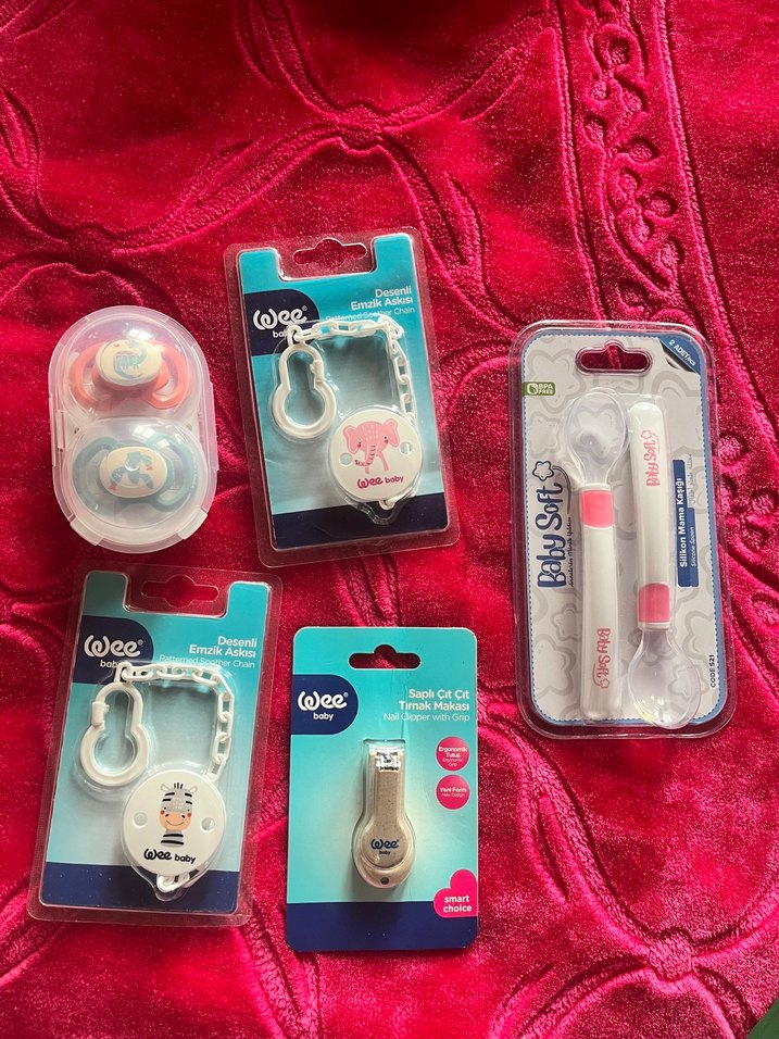 Wee marka, renkli baskılı plastik parçalar içeren bebek bakım seti. Velcro özelliği ile kolay kullanım sağlar. Tek tek de satılır fiyat sorunuz bazıları satıldı