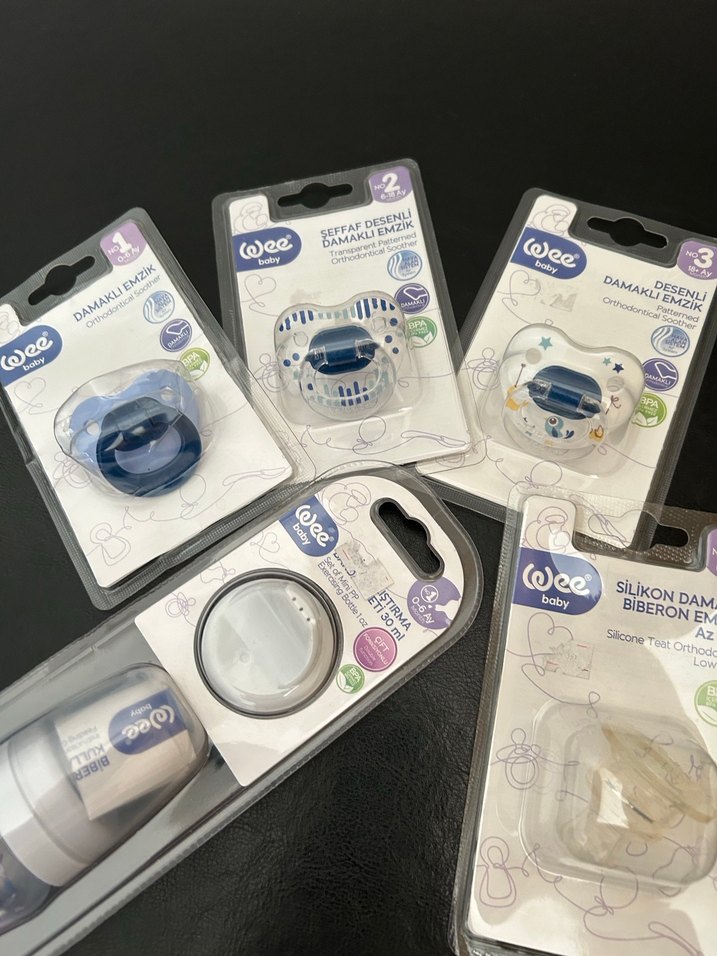 Wee bebek emziği, mavi ve gri renklerde damak desenli yapıya sahiptir. Nefes alabilen kalkana ve yumuşak, güvenli malzemeye sahiptir.