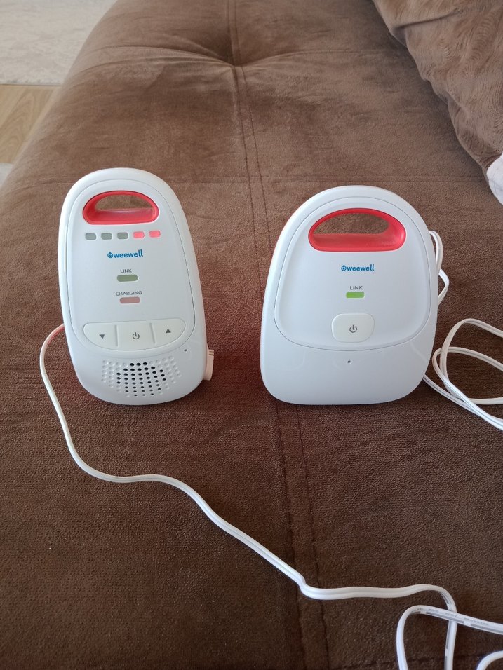 Hoparlör ve kontrol düğmeleri bulunan digital Alman malı WEEWELL Bebek telsizi.Kendi torunumundu.E-Bebek mağazasından alındı.(0) Gibidir, hiç bir yerinde hiç bir sorunu yoktur.Diğer bir odada uyuyan bebeğinizin uyandığında ağlama sesini size güçlü bir şekilde bildiriyor.Çok faydalı bir cihazdır.Adaptörlü Kablo uzunluğu her biri 2,06 m.
