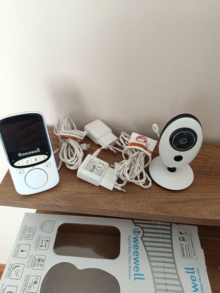 weewell bebek monitörü ve kamera seti, standlı beyaz-gri kamera, ekranlı taşınabilir monitör ve güç adaptörlerini içerir. son fotoda özel çektim öndeki küçük ışık çıkan yerin şeffaf camı yok ama kullanıma engel değil herşeyi yepyeni
