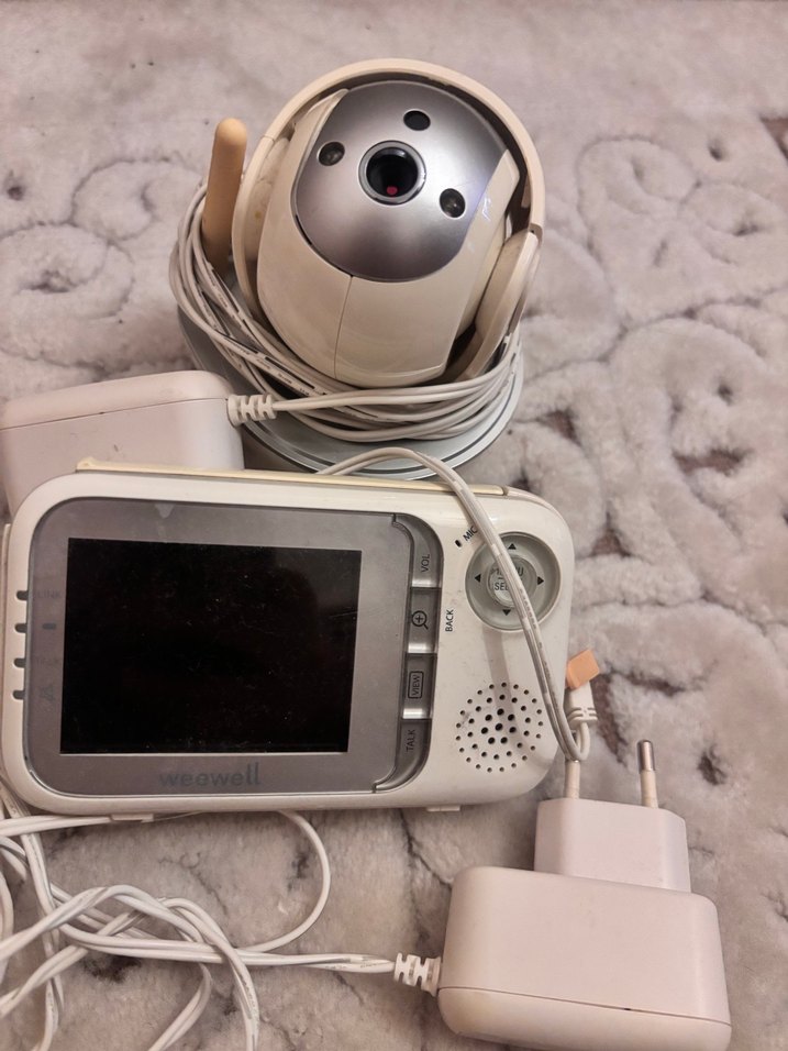 Weewell marka beyaz ve gri bebek monitörü ve kamera seti, kamera, monitör ve şarj cihazı içerir, sesli ve görüntülü izleme sağlar.