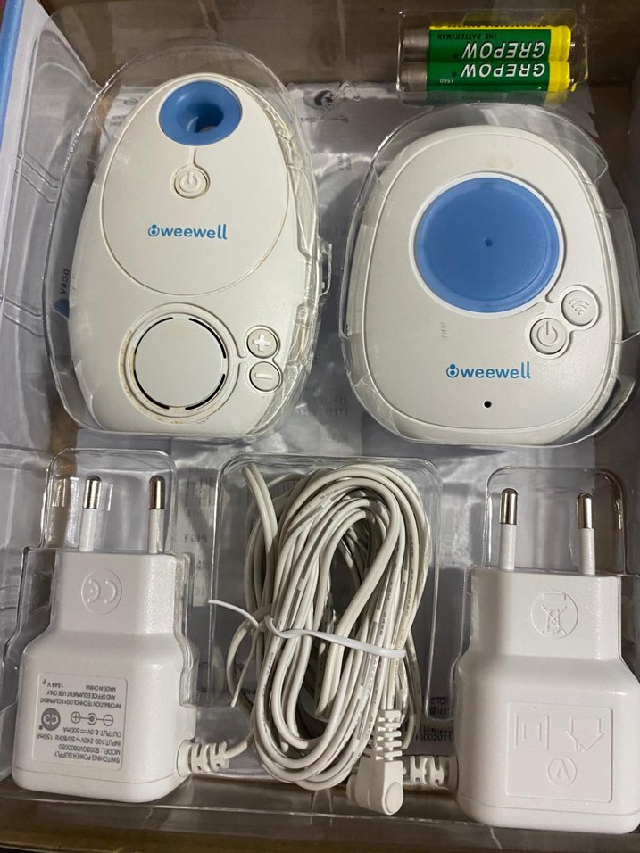 Weewell marka beyaz bebek monitörü seti, iki ünite, kontrol düğmeleri, adaptörler ve kablo içerir.
