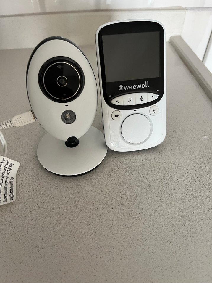 Weewell bebek monitörü ve kamerası, beyaz ve gri renklerde, net ekrana ve kullanımı kolay kontrol düğmelerine sahiptir. Güvenilir bebek takibi sağlar.