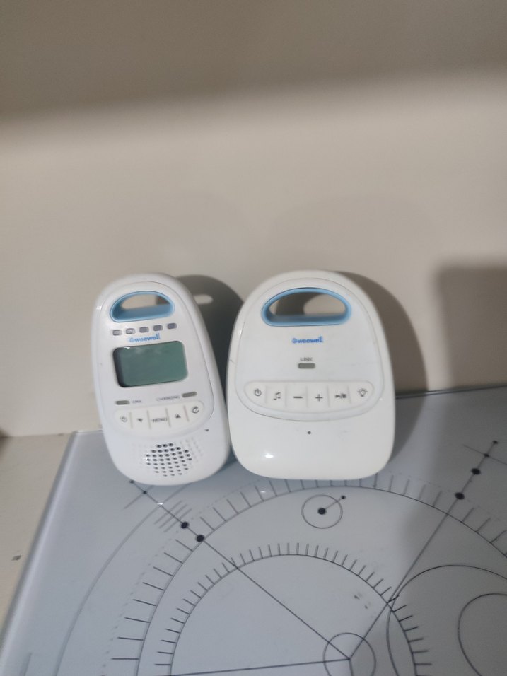 Dijital ekran ve kontrol düğmelerine sahip beyaz gri bebek monitörü ve kamera, net ses takibi sağlar.
