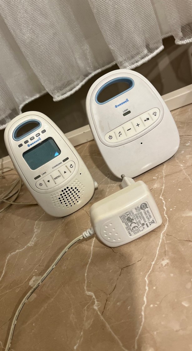 Sesli iletişim ve şarj adaptörü dahil beyaz bebek telsizi. Kompakt tasarım ile kolay kullanım. sorunsuz calisir durumdadir.
