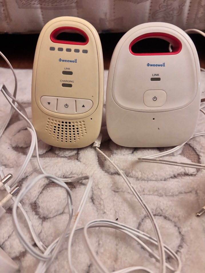 Weewell marka beyaz bebek telsizi, bağlantı ve şarj göstergeleri, kullanımı kolay düğmeler ve dahili hoparlörlerle. Açık renk tonunda.
