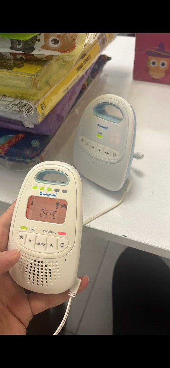 Weewell beyaz bebek telsizi, dijital ekran, sıcaklık ve batarya göstergesi, kontrol düğmeleri ve şarj göstergesi ile. Dubleks evimizde sorunsuz çekiyor.